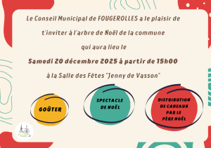 *Ce samedi 20 décembre, c’est l’Arbre de Noël pour les enfants de Fougerolles ! Les enfants et leurs parents sont ainsi invités à 15h à la salle des fêtes Jenny de Vasson, pour assister à un spectacle, avant une animation surprise… puis la distribution des cadeaux par le Père Noël et un goûter. Venez nombreux !